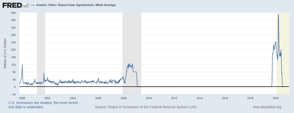 Anonymous: In September 2019 the Fed intervened in the repo. markets for four consecutive days, pumping $75 billion per day into the banks, as the inter-banking interest rate – the repo rate – peaked at a terrifying 10% [1]. If this level were allowed to contaminate regular highstreet lending, it would cause widespread debt defaults & insolvencies.