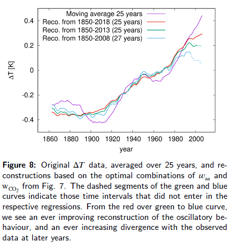 This Arxiv preprint employs a multiple regression analysis with the time series of the geomagnetic aa-index as a proxy for solar activity (“aa-index”) as an independent variable along with the logarithm of CO2 concentration commonly used in climate models. Stefani shows that the temperature variation since the middle of the 19th century can be repro-