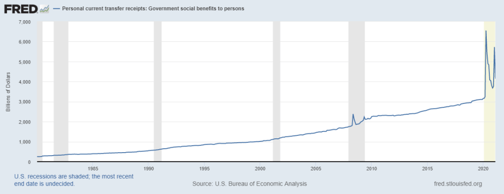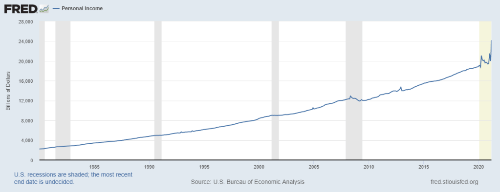 Simply put, it’s government welfare. And that welfare is behind the record surge in personal income in March when China Joe, the Sock Puppet “president,” distributed $1.9 trillion in “stimulus checks”.