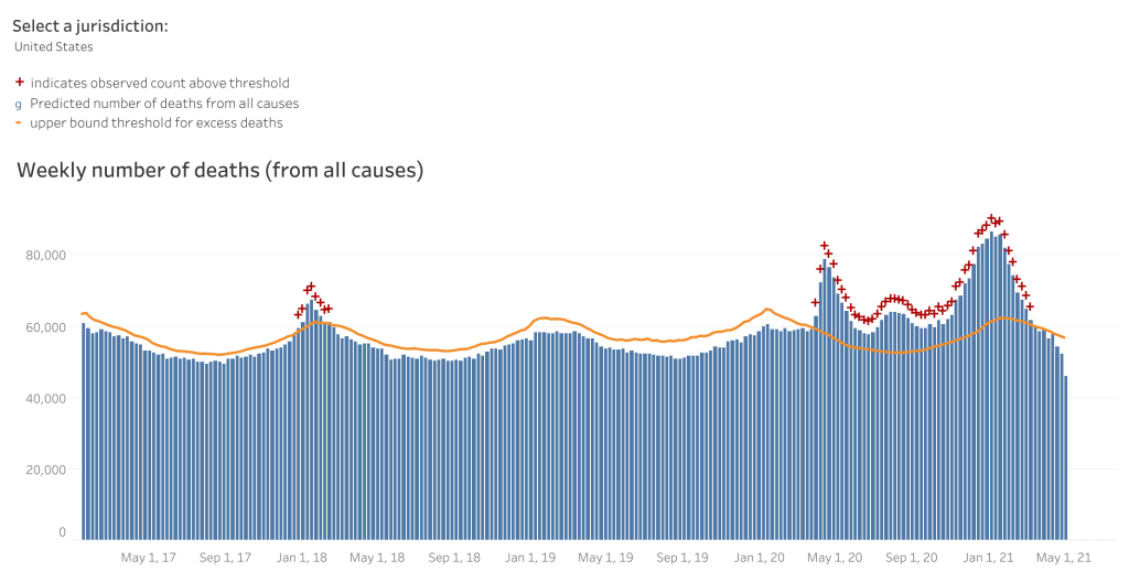 But what about the lag in data? We’re only looking at data up to mid-March because it tends to take several weeks for estimates of total deaths to become reasonably reliable. Yes, that data shows a big drop off. But what about the numbers for April and May? Should we expect those death totals to surge again with a promised “fourth wave” of new covid death?