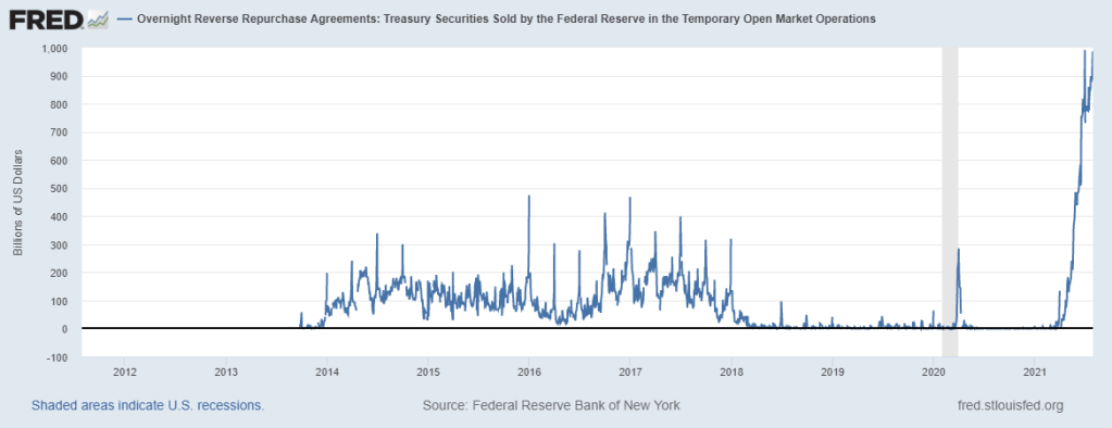And with QE still running at $120 billion a month, the Fed continues to inject liquidity into the markets, which then continues to recycle back to the Fed via the RRP facility.