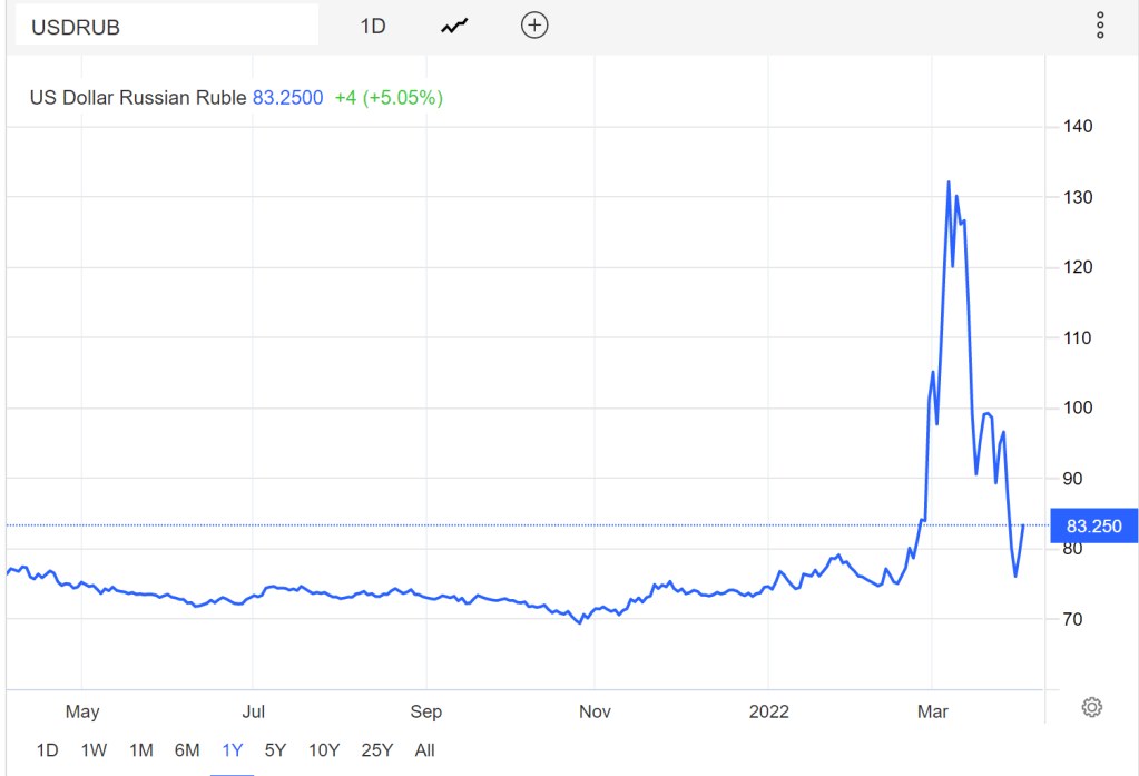 We can see this linkage in action since Friday 25 March when the Bank of Russia made the fixed price announcement. The ruble was trading at around 100 to the US dollar at that time, but has since strengthened and is nearing 80 to the US dollar. Why? Because gold has been trading on international markets at about US$ 62 per gram which is equivalent to (5000 / 62) = about 80.5, and markets and arbitrage traders have now taken note, driving the RUB / USD exchange rate higher.