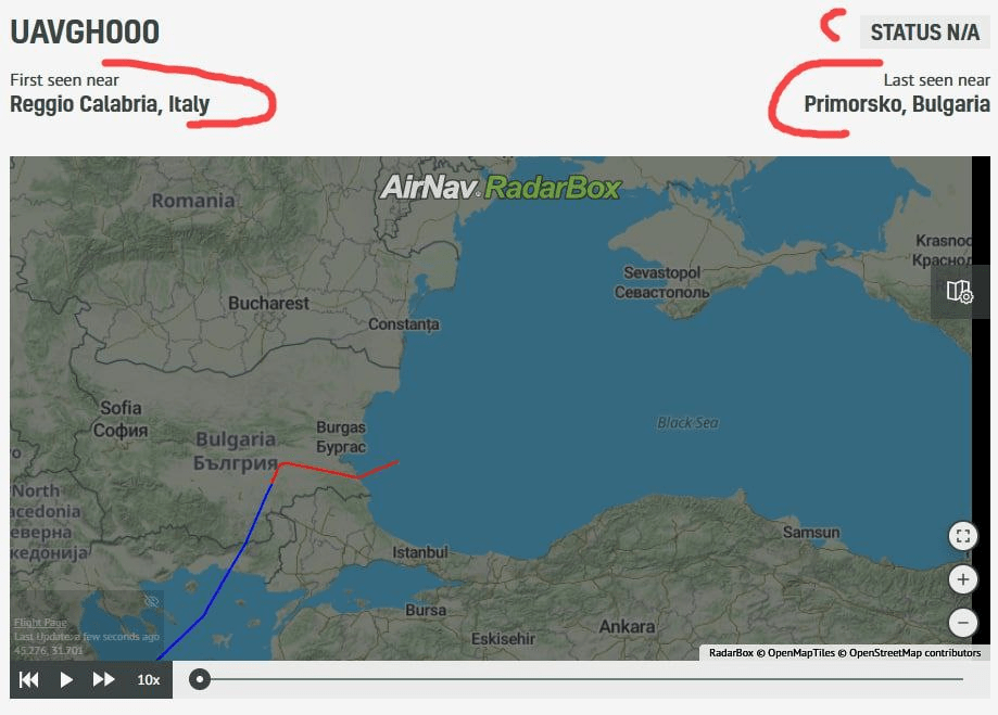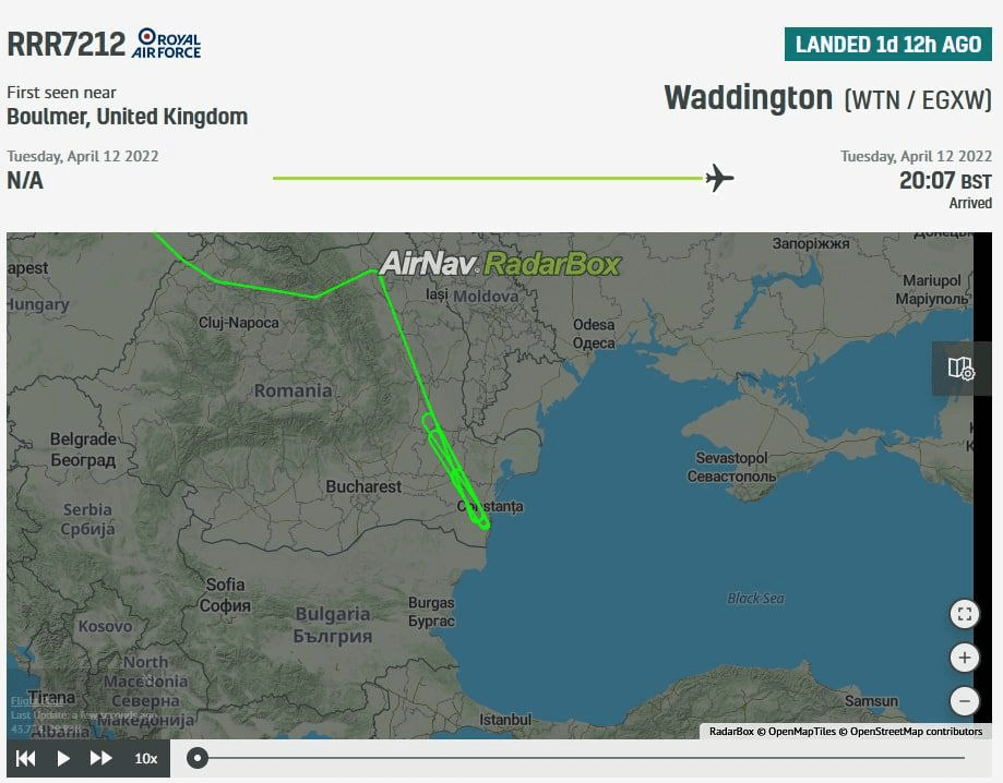 Movement of a British reconnaissance plane through Romanian territory. It is likely that the transponders were turned off before flying into the Black Sea.