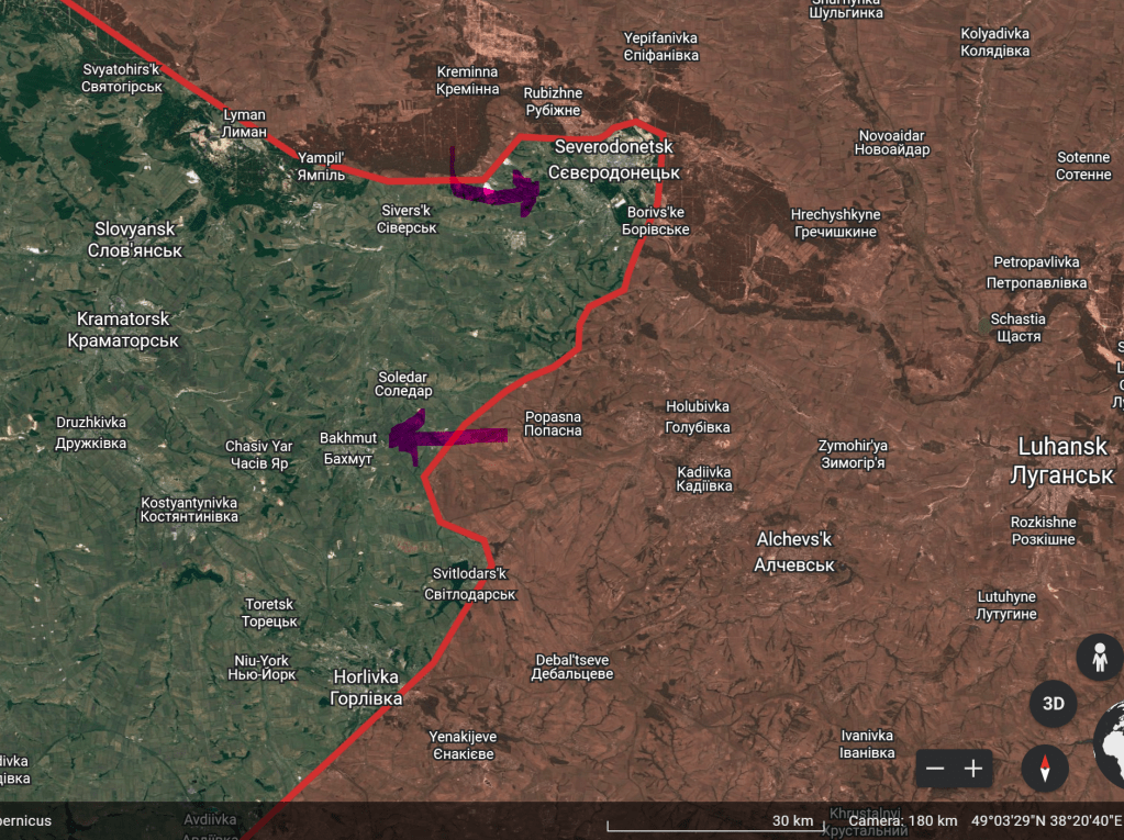 The map below shows the threat axes towards Bakhmut and Severodnoetsk (2nd Guards Tank Army).