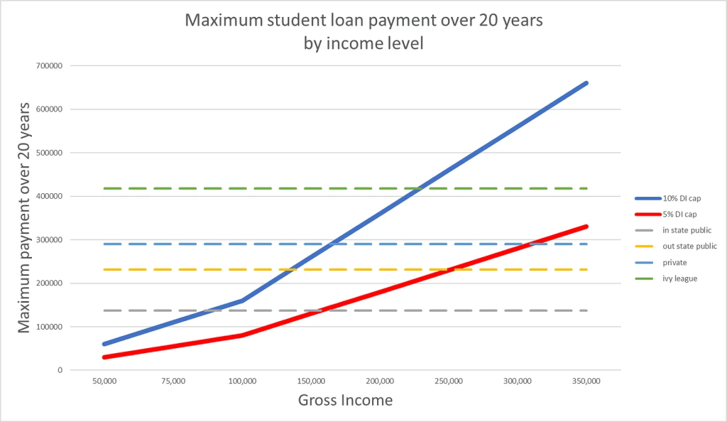 let’s say you plan to go into a nice career with $100k in income. that’s 80k of DI, so your cap on loan payment is $4k per year X 20 years = $80k.