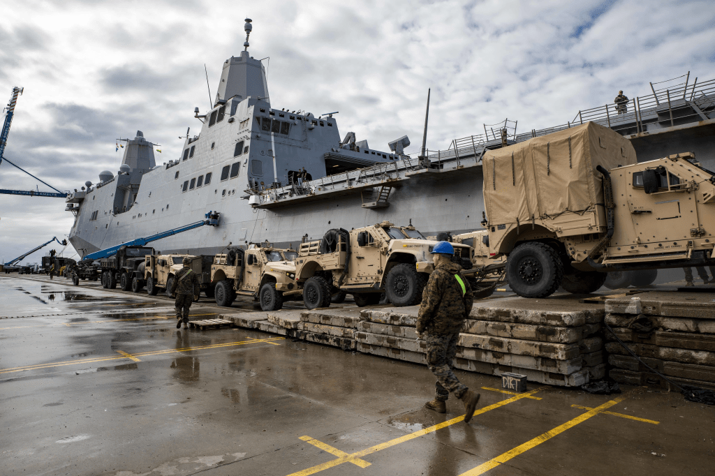 Marine Corps vehicles assigned to the 22nd Marine Expeditionary Unit (MEU) line up for an agricultural washdown outside the San Antonio-class amphibious transport dock ship USS Arlington (LPD-24) during a scheduled port visit to Klaipeda, Lithuania, Sept. 15, 2022. US Navy Photo