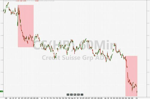 And CS credit risk has spiked to record highs this morning, topping 280bps at one point – basically disallowing the company from any investment banking business. This is higher than the bank’s credit risk traded at the peak of the Lehman crisis…