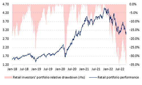 And while retail investors may have bought… or sold… stock in during the latest meltup, depending on whose “research” one reads, one thing is clear: the recent sell-off in retail favorites such as AAPL and TSLA has had a large impact on retail portfolios’ performance and as of yesterday, the average retail portfolio’s relative drawdown is again close to -32% and has started to underperform the S&P 500 again.