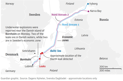 EU authorities have guesstimated an explosive load of “several hundred kilos” to destroy Nord Stream pipelines, which triggered four leaks at four locations — two in Denmark’s waters and two in Sweden’s waters. [Note: consistent with an antimine torpedo]