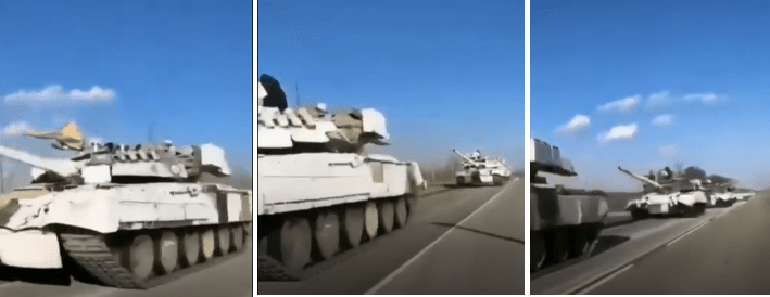 A Russian videoclip of Russian tanks repainted in winter white camouflage was recorded from a civilian car and posted this weekend on the internet; no location was identified. The car is travelling at about 40 kph; the clip lasts for one minute and when it stops, the line of tanks in the opposite lane is continuing to stretch to the horizon.