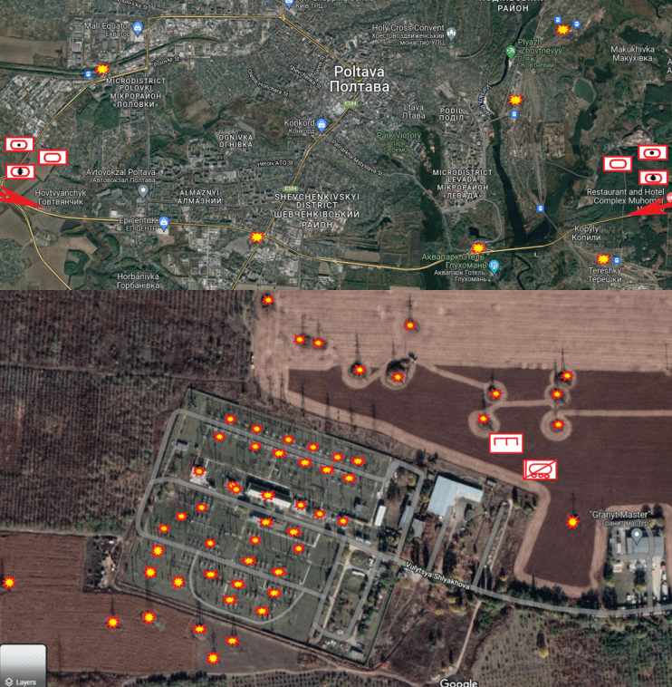 Inside the UDZ, take Poltava, for example — the source has indicated by the red arrows the western and eastern lines of approach by the Russian forces: