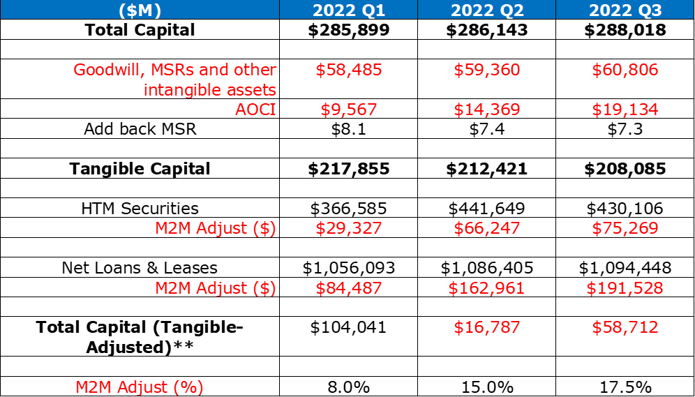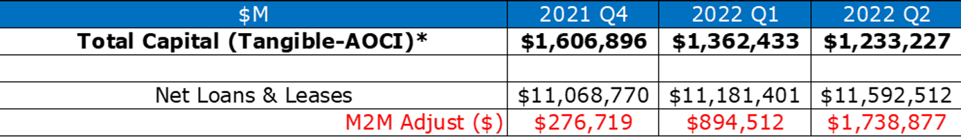 The table below shows our conservative M2M adjustment for the last three quarters on the almost $12 trillion in total loans and leases owned by banks. We adjust Q4 2021 by 2.5%, Q1 2022 by 8% of total loans and leases, and 15% of total loans and leases in Q2 2022 to approximate the low-end of M2M losses due to the rapid increase in interest rates in 2022.
