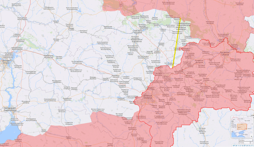This first defense line, like later ones, ran along railway and road communication routes that connect major cities. In the map above the cities that constituted the first defense line were, north to south, Siverodonetsk, Lysichansk, Popasna, Svitlodarsk.
