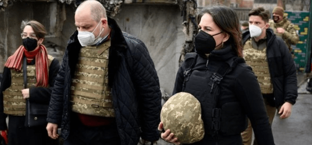 February 8, 2022 – Annalena Baerbock (right) with Ukrainian military escort in the Donbass.