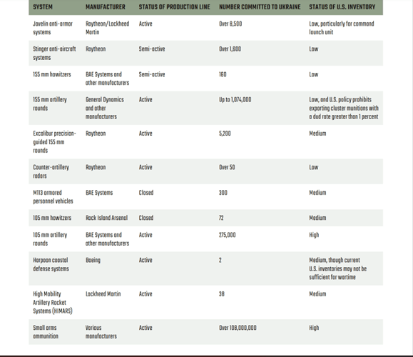 - “Nevertheless, battlefield consumption rates in Ukraine have strained the defense industrial base to produce sufficient quantities of some munitions and weapons systems. Since many of the weapons systems and munitions have come directly from U.S. inventories, U.S. assistance has depleted some stockpiles that could be used for training, future contingencies, or other operational needs.”