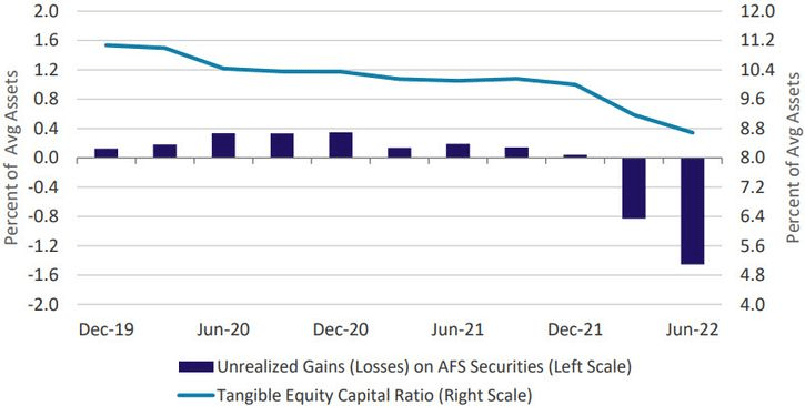 TCE is declining industrywide because of the negative effect of rising rates on the market value of bank holdings of AFS securities. The number of banks with ratios of TCE to average tangible assets of less than 5% jumped markedly in 2022, with some banks posting negative TCE. Banks in this position largely got there because of an aggressive earnings strategy based on longer-term securities holdings when interest rates were low.