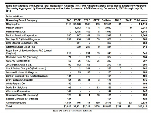 The ability of the mega banks on Wall Street to have “sound risk management and control practices” would have far more credibility were it not for the fact that century old mega banks on Wall Street either blew up in 2008 or were on the verge of blowing up when the Fed decided to secretly inject them with cumulative loans totaling $16.1 trillion over two and a half years, according to an audit conducted by the Government Accountability Office. (See chart below from that audit.)