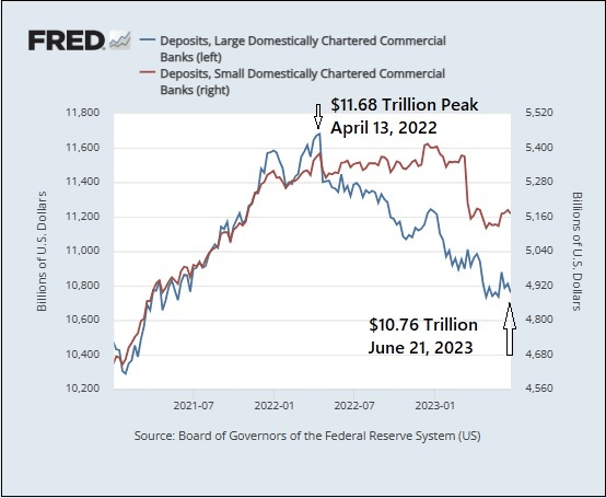 Wall Street On Parade: https://wallstreetonparade.com/2023/07/large-banks-have-bled-921-billion-in-deposits-since-april-2022-the-fastest-pace-in-40-years-and-a-much-larger-decline-than-small-banks/