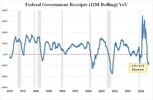 Here is some more context: tax receipts of $429.3BN in December were down 5.6% from the $454.9BN in December 2022 and down a whopping 11.8% from December 2021. On an LTM basis, US total tax receipts were $4.521TN, or down 7.2% YoY. This is now the 9th consecutive YoY decline in LTM tax receipts, something that historically has only taken place when the US was in a recession. As an aside, the “smart economists” were certain that the collapse in tax receipts would reverse after November when the postponed California taxes would be collected. Well, November has come and gone and the big picture is just as ugly.