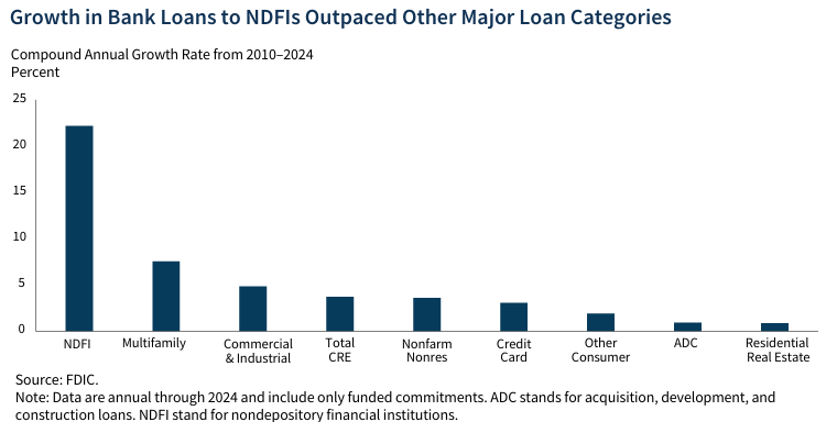 The rapid, sustained rise in loans from banks to non-depository financial institutions (NDFIs) — which grew at a 21.9% compound annual rate from 2010 to 2024 — increases systemic risk by creating intense interdependencies. These exposures, particularly through credit lines, can act as transmission channels for financial distress, as bank stability becomes directly tied to the performance of often-leveraged nonbank lenders.