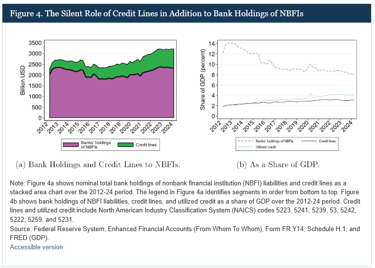 The Fed observes Ccedit lines to NBFIs have more than doubled since 2012, partially offsetting the decline in direct funding. This shift indicates a re-allocation of bank exposures away from direct holdings to contingent liabilities which are off-balance-sheet vulnerabilities.