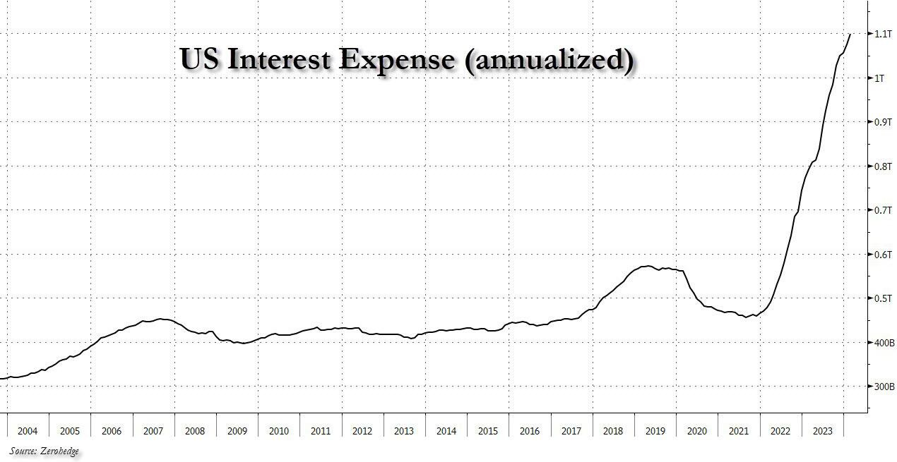 In fact, there is no doubt about it. A few years back Federal interest expense was $300 billion per year, but has already vaulted to nearly $1 trillion. But that’s on public debt which is $34 trillion and a weighted-average rate of interest that is still under 3.0%.