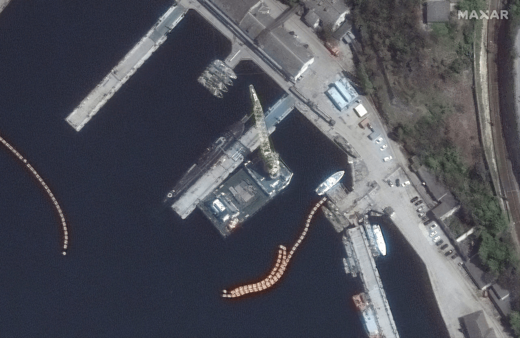 A satellite image shows loading of probable Kalibr missiles on a Kilo-class submarine in the Black Sea port of Sevastopol, Crimea, April 29, 2022. Satellite image 2022 Maxar Technologies/Handout via REUTERS