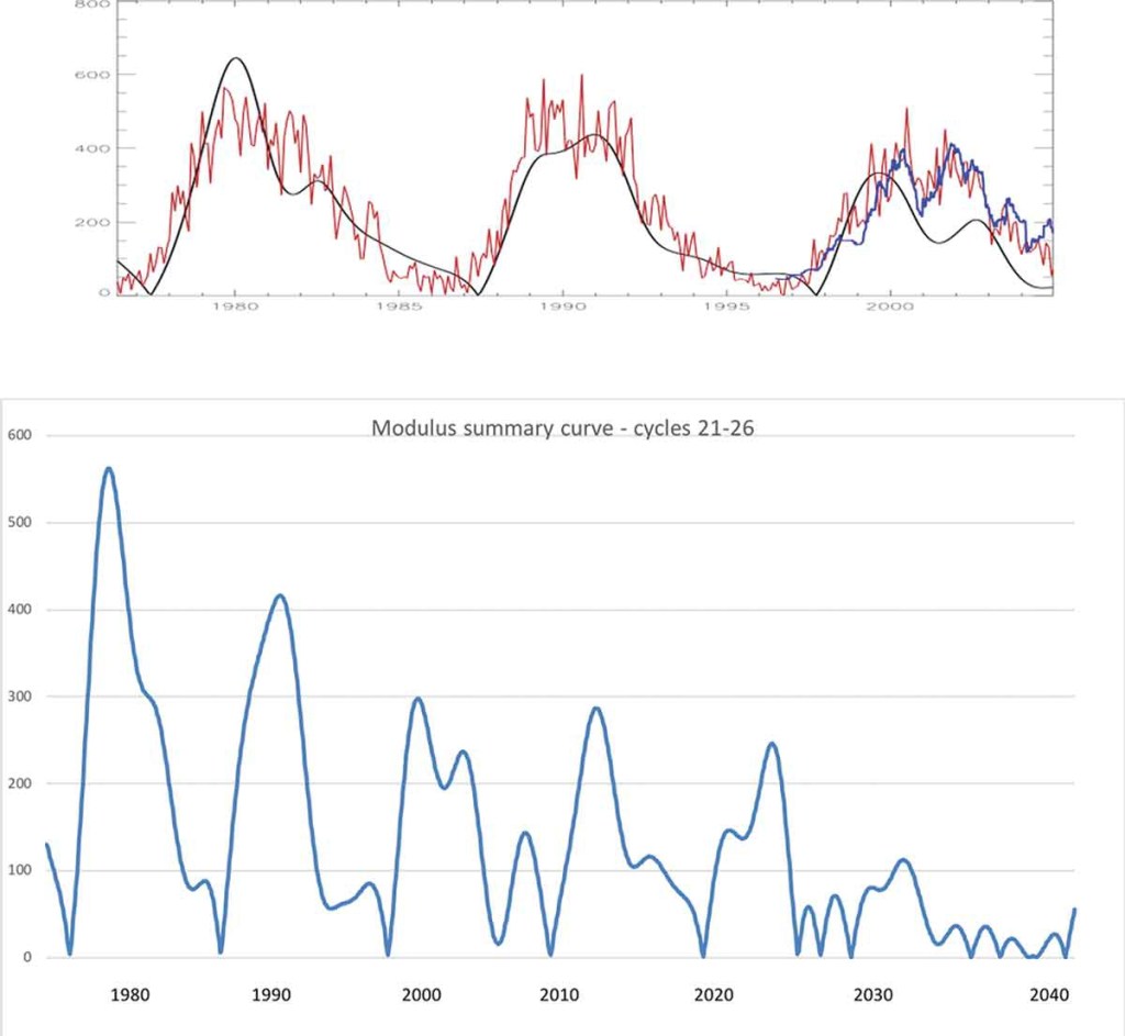 The modulus summary curve obtained from the summary curve are shown in the top plot as a black curve. The bottom plot presents the modulus summary curve associated with the sunspot numbers derived for cycles 21–23.
