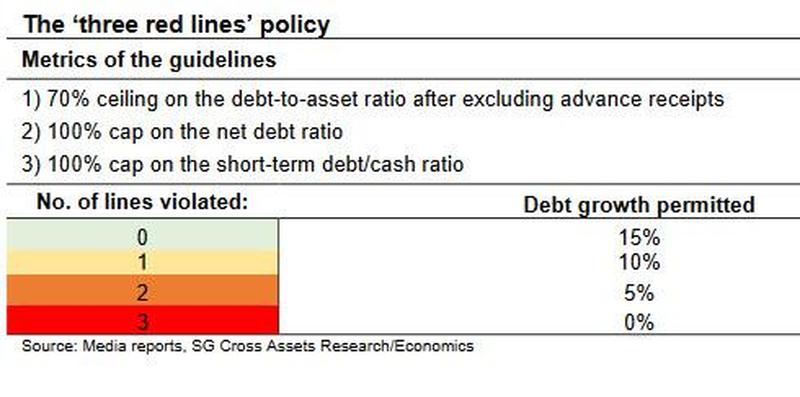 “Future debt growth of real estate companies will be restricted in various degrees based on their current leverage as measured by these metrics (see the table below). In the harshest scenario, a developer will not be allowed to raise any more debt. Based on its current financial situation, Evergrande would in fact fall into this category.“